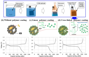 まず、リチウムポリスルフィドの溶出を防ぐ手法として、正極表面を負に帯電したポリマーでコーティングするという検討がなされていました(図2(a))[1]。このコーティングによりポリスルフィドアニオン(Sn2)が静電反発により正極上に留まります。その結果,コーティングなしの場合(図2(b))と比較して,架橋ポリマーコーティングを施した場合(図2(d))は過充電が抑制されました。