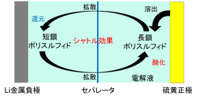 現在広く用いられているリチウムイオン二次電池の容量は,グラファイト負極の理論容量(372 mAh g1)に達しつつあります.そこで高理論容量(1672 mAh g1)を示す硫黄を正極に用いるリチウム硫黄二次電池が注目を集めています。しかし、電解液へと溶出した反応中間体のリチウムポリスルフィド(Li2Sn, 4≦n≦8)が、正極と負極の間を拡散により往復し,正極上での酸化反応と負極上での還元反応が繰り返されるという問題があります(図1)。これはシャトル効果と呼ばれ,過充電の原因となります。また硫黄や放電生成物のLi2Sが低電子伝導性および低イオン伝導性を示すことから、充放電時に高い過電圧がかかるという問題もあります。当研究室ではこれらの問題を解決すべく研究を行っています。