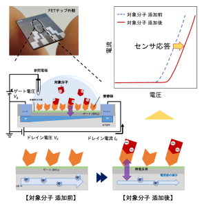 FETバイオセンサとは、荷電した標的分子の吸着によるゲート絶縁膜表面の電位変化を電界効果によるキャリア濃度の変化として検出するセンサです。半導体加工技術による通信回路等との集積化や、マルチチャネル化による複数の対象の同時測定、小型化が期待されます[1]。また、大量生産によるコストダウンも見込まれます[1]。当研究室はこれまで、 FETバイオセンサを用いた生体分子検出に取り組んできました。具体的には、抗体あるいは抗原結合性フラグメントをプローブとした腫瘍マーカーの検出や抗原を固定化した系での免疫グロブリンEの高感度検出、アルツハイマー病の早期発見に向けたコンゴーレッド固定化FET によるアミロイドβの検出、糖鎖固定化FET によるインフルエンザウイルスの検出などが挙げられます[2][3][4][5][6]。最近では、等温核酸増幅法を利用したRNAの高感度検出や、競合法を利用した抗がん剤5-Fluorouracilの検出を実現しました[7][8]。現在は、ストレスホルモンとして知られるコルチゾールの高感度検出や、センサ応答の再現性向上に向けた測定システムの構築に取り組んでいます。