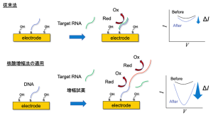 アンペロメトリックセンサとは、定電位における電極と酸化還元種間の電子の授受を電流値として測定するセンサです。 標的分子の濃度に依存した酸化還元反応に由来する電流値の変化を利用して、標的分子の検出を可能とします。利点としては、特定の電位印加により、目的の酸化還元反応のみを起こすことが可能であり、夾雑物の影響を受けにくいことが挙げられます。現在は、RNAの高感度検出に向け、等温核酸増幅法の適用に焦点を当て、アンペロメトリックセンサの作製に取り組んでいます。核酸増幅法の適用により、酸化還元反応量の増加に伴い、電流値変化量が増加することが期待されます。